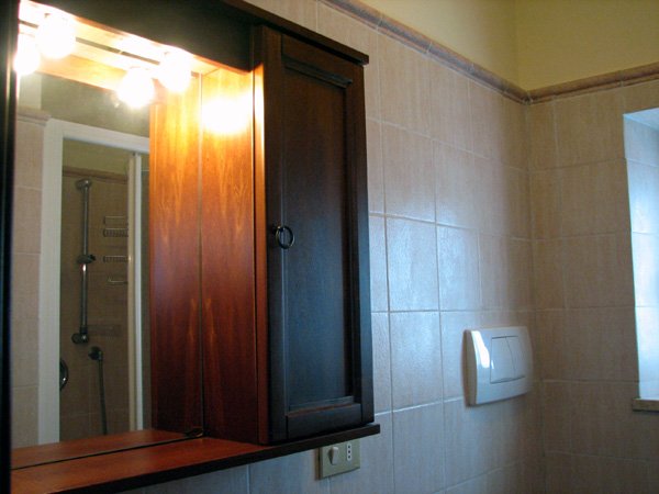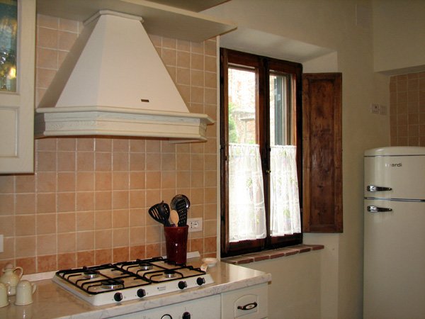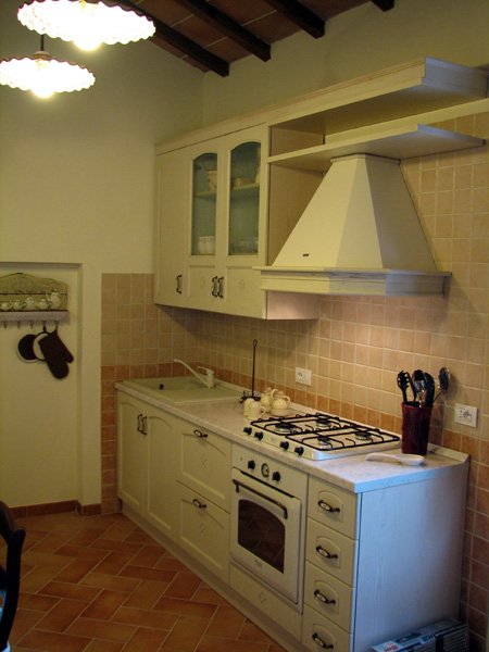 I hated the old kitchen. There! I’ve said it!!! Now, we have brand new country-style kitchen furniture in the tones of cream and hazelnut-tree wood. We have a nice fridge with freezer compartment (isn’t that essential in Tuscany!? Where are you going to store your gelato otherwise?!), a nice oven and much more room for storage. The washing machine, which used to be in the closet, is now in the kitchen… essentially in the same spot as before, but the closet has been moved to make the kitchen wider. The fireplace is still in its place. There was no way we would move that! It has always worked perfectly, with no smoke at all in the house. That’s so rare in these old buildings!