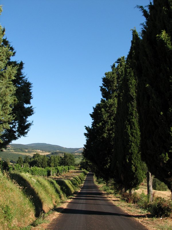 From Monte Antico a picture perfect cypress tree-lined road climbs up to the top of a hill, where the ancient Castle of Monte Antico is located. The castle looks like a fortress from the outside, and it is now a beautiful hotel. It has a lovely courtyard with a well, and breathtaking views over the valley of the river Ombrone.