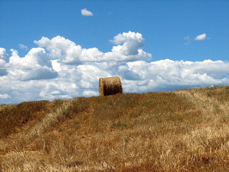 I turned around and drove back down to Monte Antico, along the road that runs below the castle. There are a few spots where one can stop and enjoy the view over the hills towards Civitella. The fields have just been harvested and the hay bales are still there: so pretty!